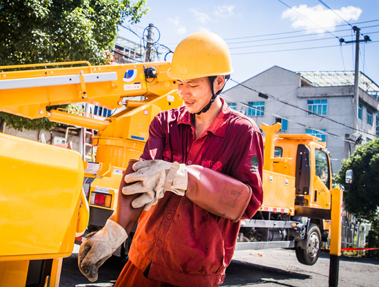 7月21日,国网缙云县供电公司带电作业人员在10千伏东方线35号杆利用绝缘平台带电安装智能开关。楼拓斌 摄