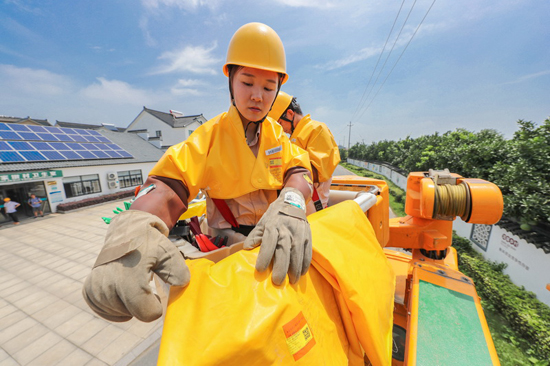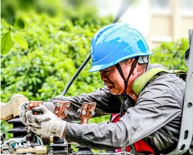 7月22日,国网德清县供电公司带电作业人员在钟管镇沈家墩村对高压线路开展带电消缺,不停电的情况下更换故障开关,确保夏季用电安全可靠。陈海龙 摄